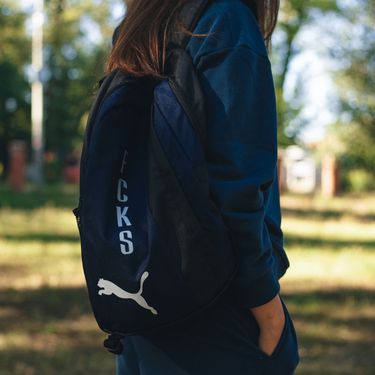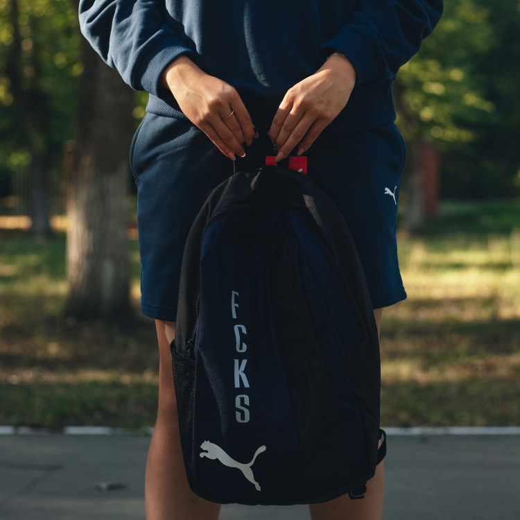 Рюкзак Puma темно-синий, с черными вставками, с логотипом FCKS. Состав: 100% полиэстер. Размер изделия: 45 см высота, 25 см ширина.