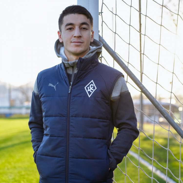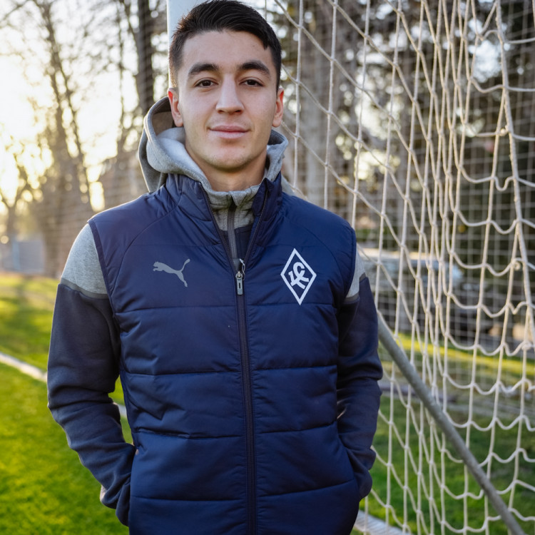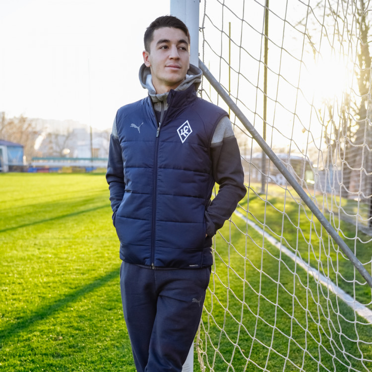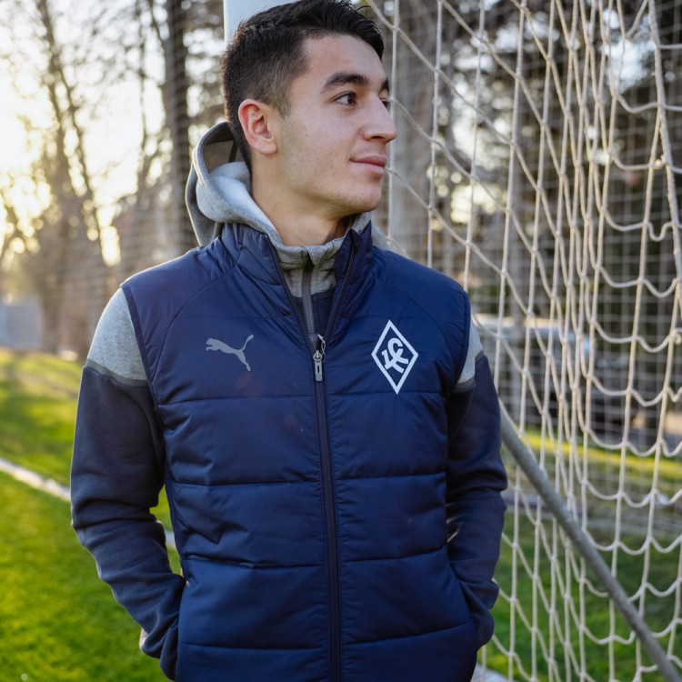 Жилет синий сезон 2024/25 Puma. Логотип Ромб КС вышивка на груди слева нитками белого цвета. Жилет на молнии. Наполнитель - синтепон.