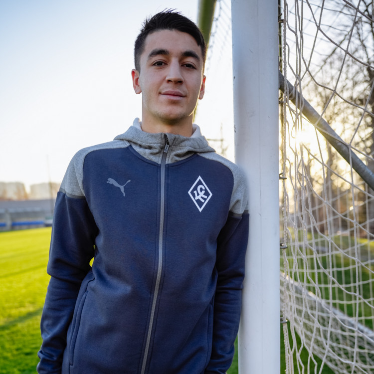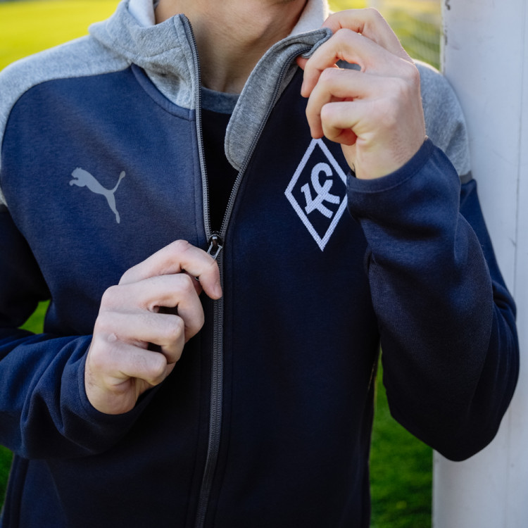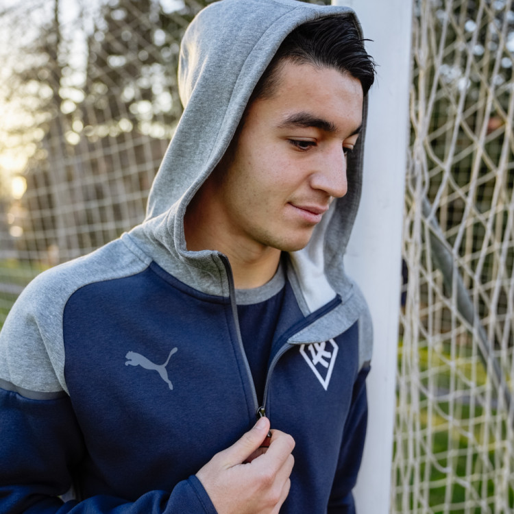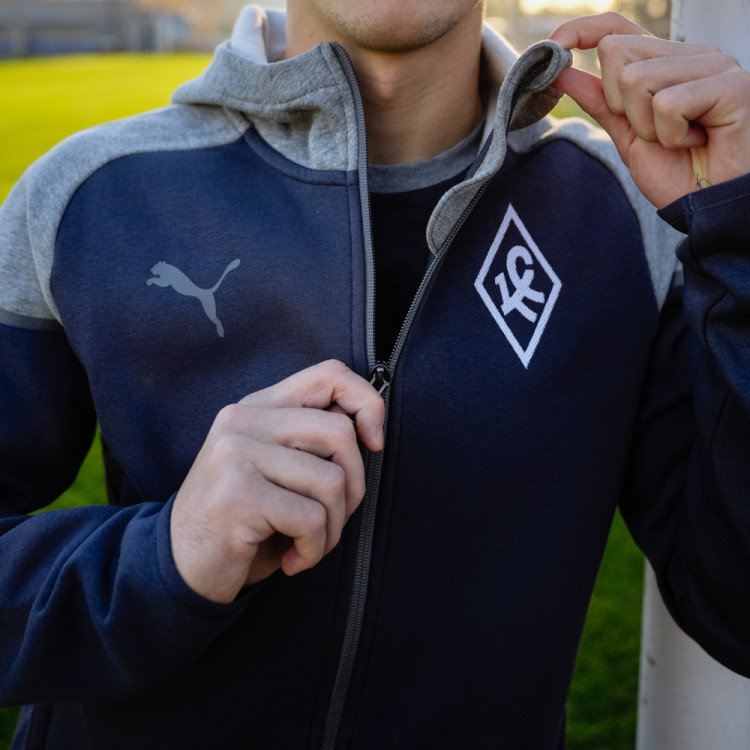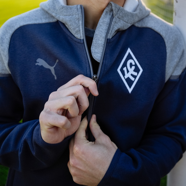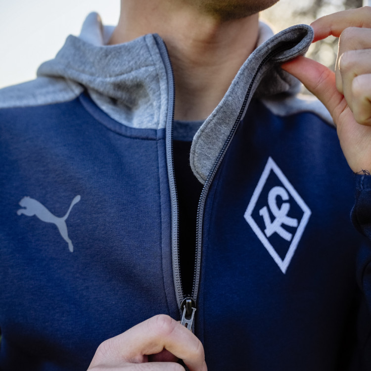 Толстовка х/б синяя сезон 2024/25 Puma. Толстовка на молнии и с капюшоном. Цвет основного изделия - синий, элементы и капюшон - серые. Логотип Ромб КС на груди справа - вышивка. Данная модель толстовки доступна к покупке как отдельно, так и в костюме с брюками. Костюм (комплект толстовка и брюки) доступны к заказу в интернет-магазине как отдельная номенклатура.