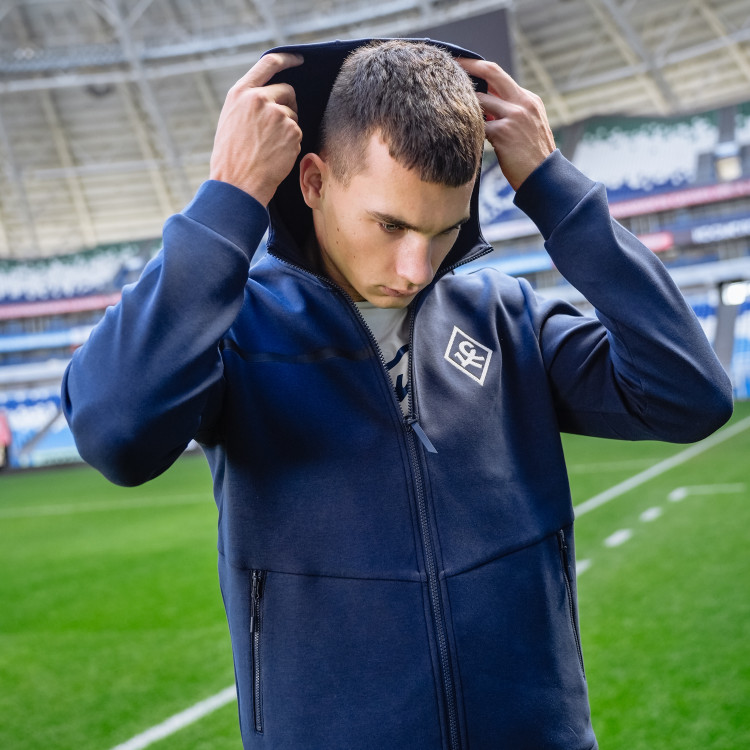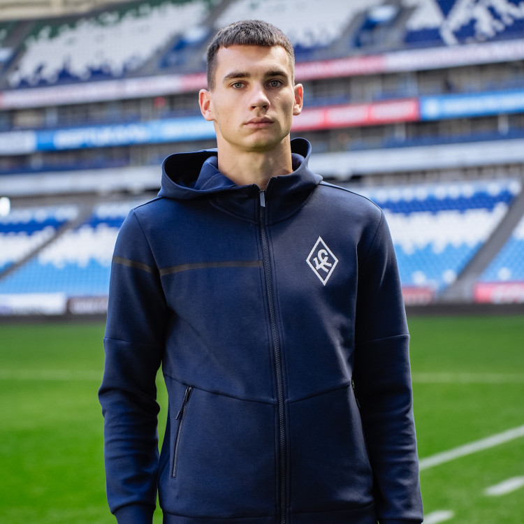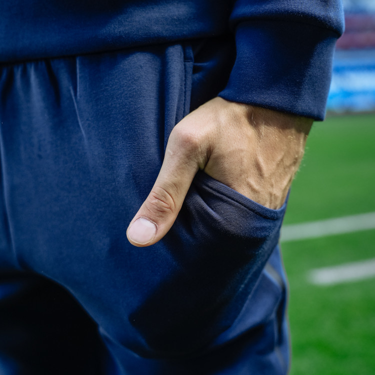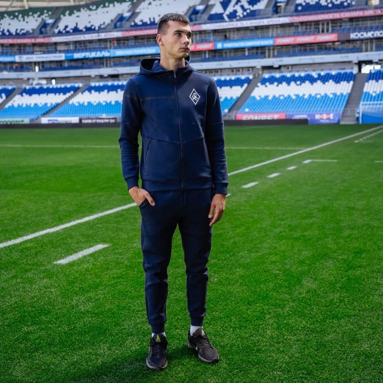 Костюм тренировочный х/б сезон 2025-2026 Kelme. Цвет - темно-синий. Костюм скомплектован из толстовки и брюк. Толстовка на молнии с капюшоном и карманами, логотип Ромб КС на левой груди. Брюки на резинке со шнуровкой, и карманами. Состав - х/б.