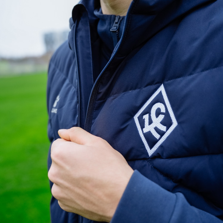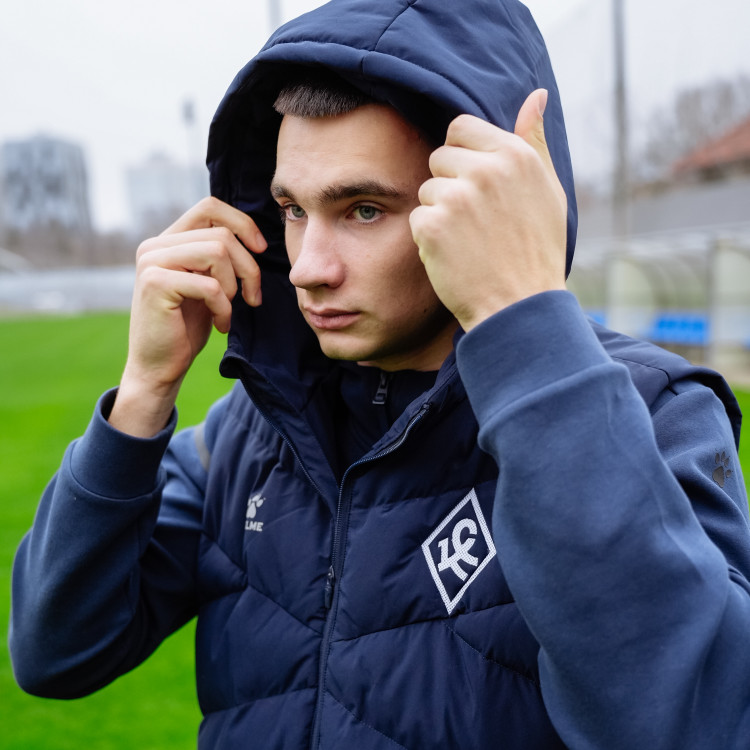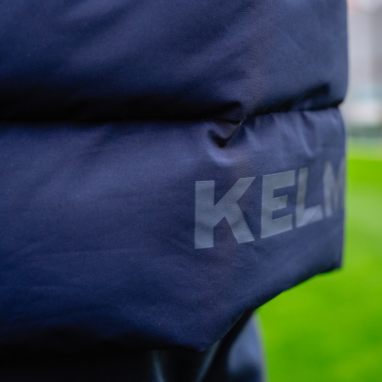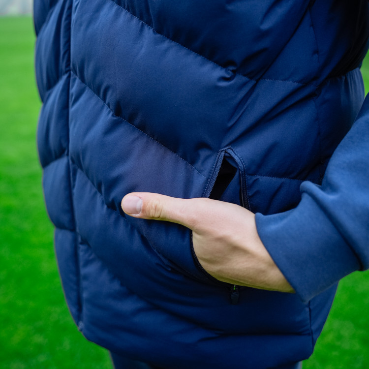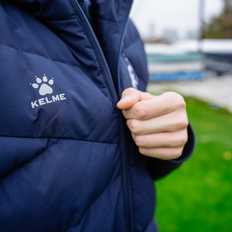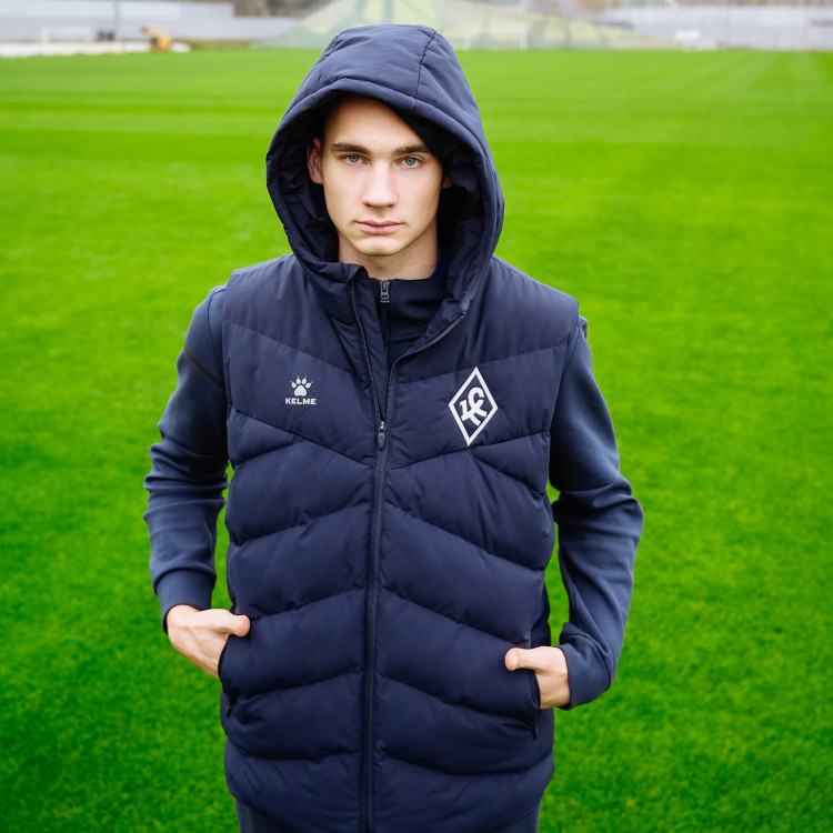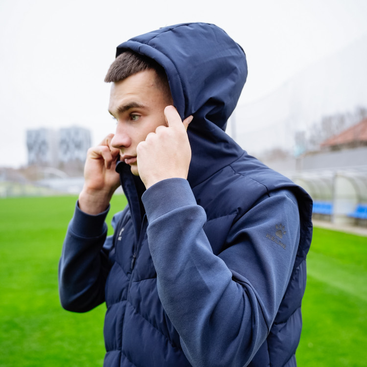 Жилет утепленный Kelme сезон 2025/2026. Застежка молния спереди. Жилет с капюшоном, карманами. Логотип Ромб КС - вышивка на груди слева. Цвет - темно-синий. Состав - полиэстер.