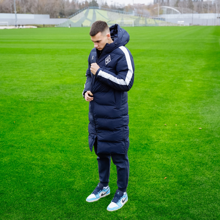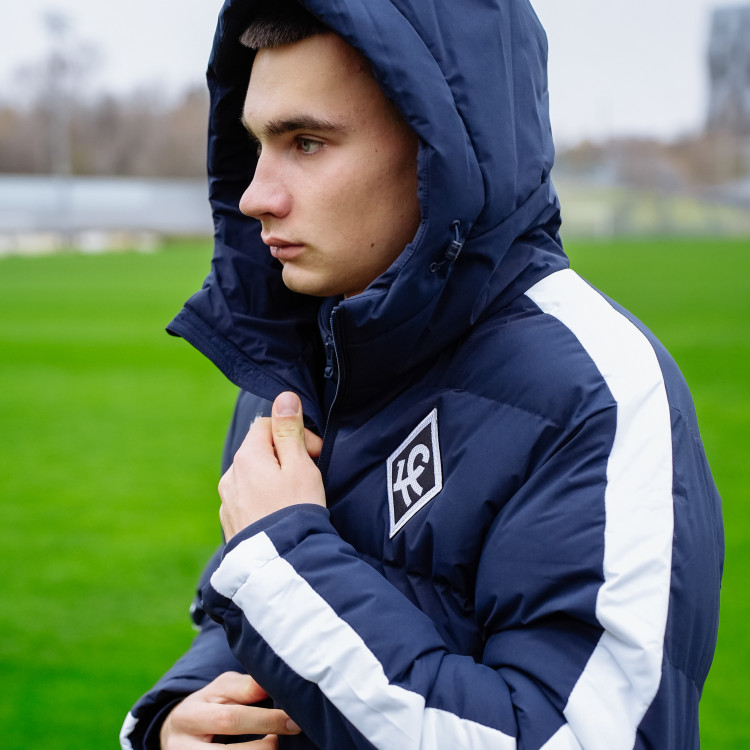 Куртка зимняя удлинённая с капюшоном сезон 2025-2026. Цвет - темно-синий. На рукавах декоративные элементы белого цвета. Застежка молния спереди и по бокам. Логотип Ромб КС - вышивка на груди слева.