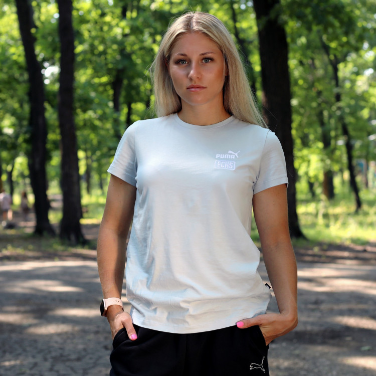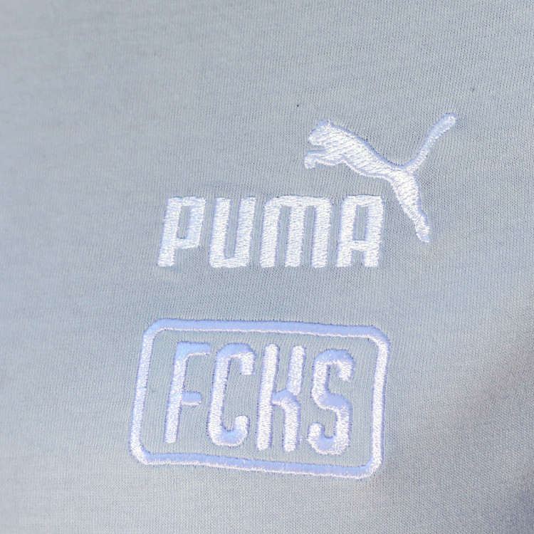 Футболка женская голубая Puma. Крой прямой. На груди слева вышивка "FCKS". Состав - хлопок.