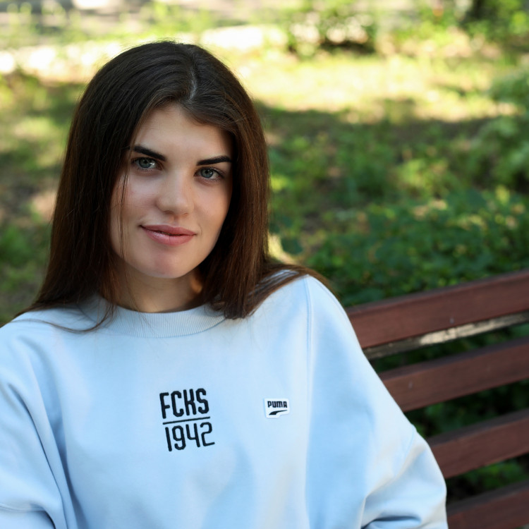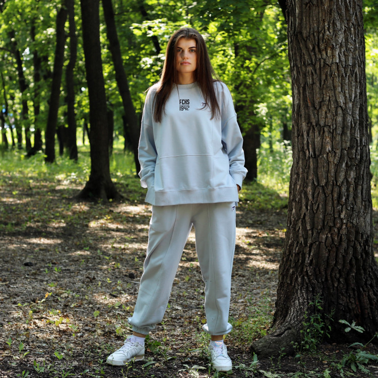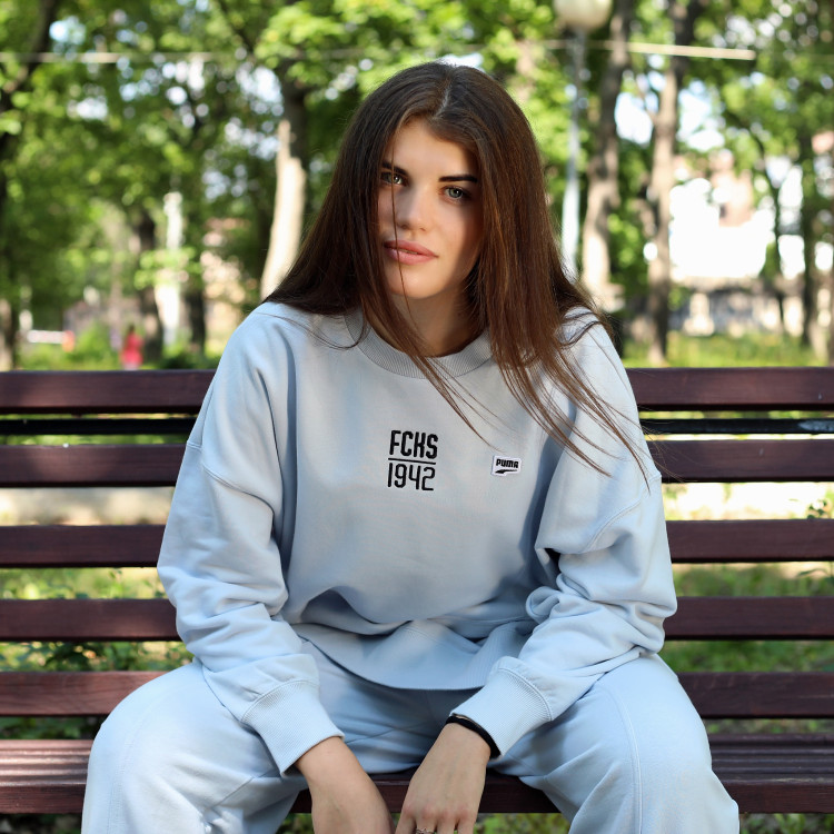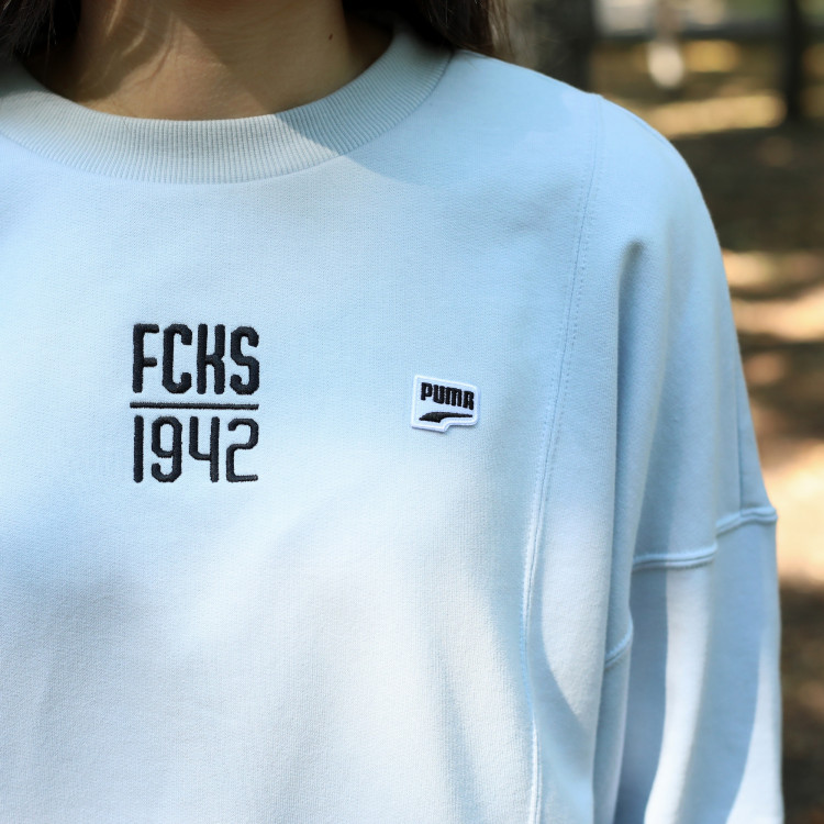Свитшот женский голубой Puma. Свитшот с разрезами по бокам и вышивкой на груди "FCKS 1942". Свитшот с брюками голубыми составляет костюм. Состав - хлопок.