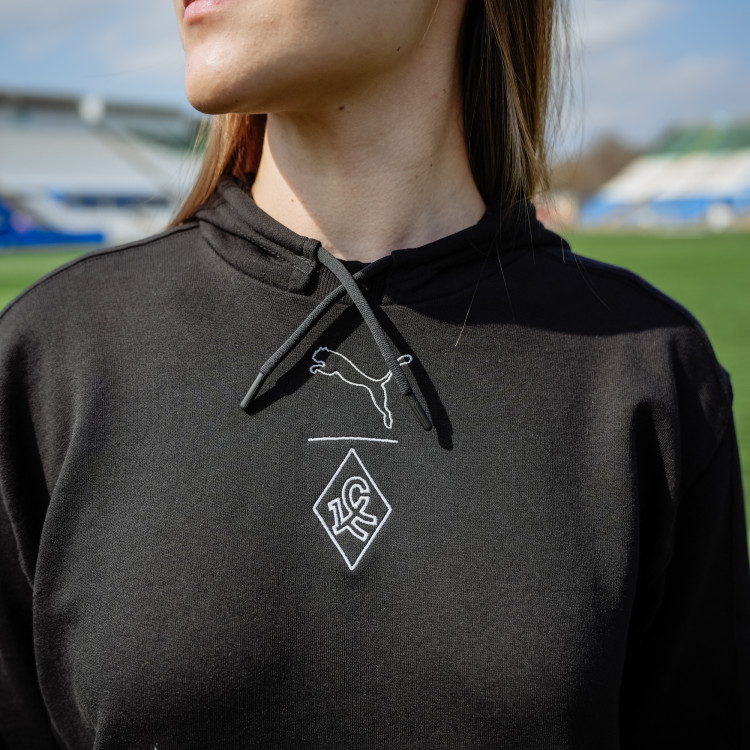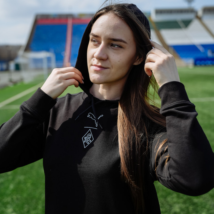 Платье-худи черное Puma. Удлиненное худи с капюшоном. Подол платья с разрезами. Логотип - Ромб КС вышивка. Состав - хлопок.