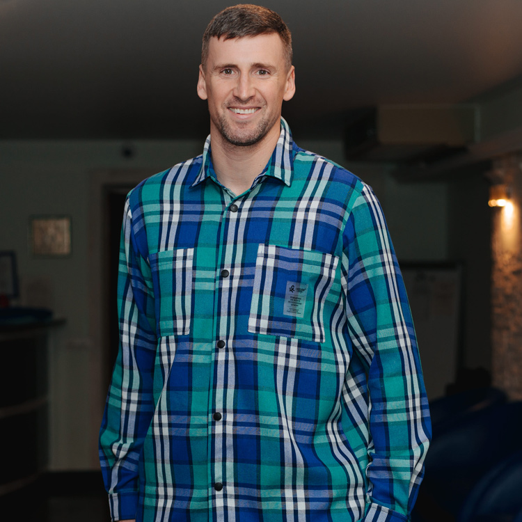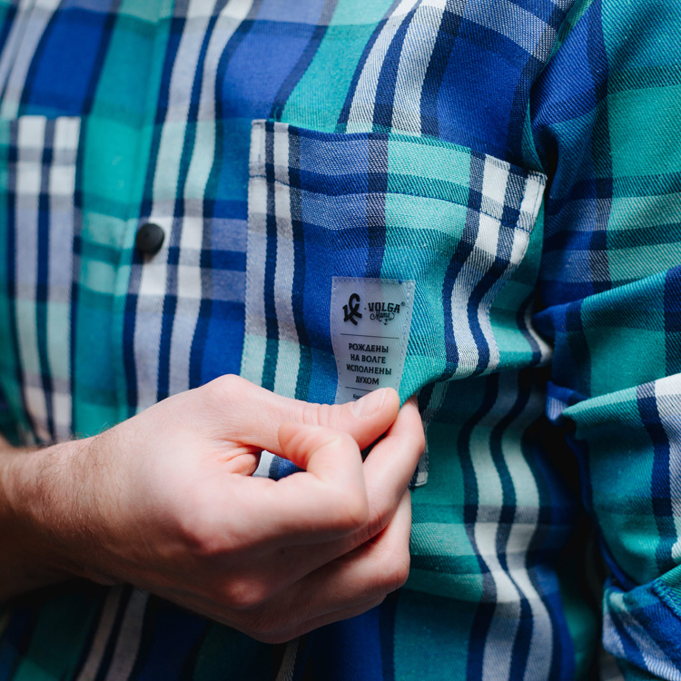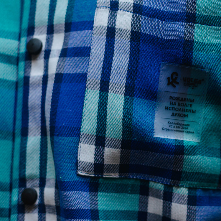 Рубашка унисекс в клетку КС. Застежка на кнопках. Накладные карманы на груди. Рукав манжет на кнопке. Низ изделия фигурный. Цвет - зелено-бело-синяя. Состав: 70% хлопок, 30% полиэстер. Рубашки представлены в размерном ряду: S, M, L, XL. Совместная коллаборация "Крылья Советов" и "Волга Мама"