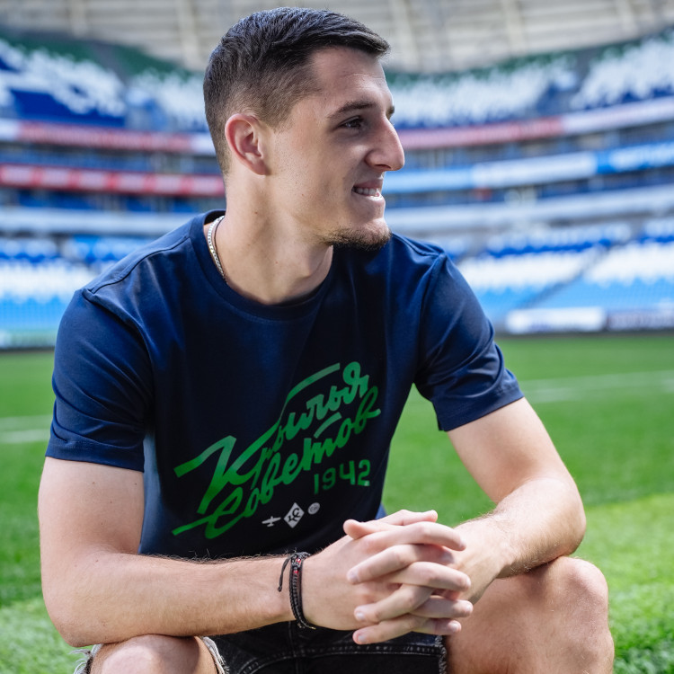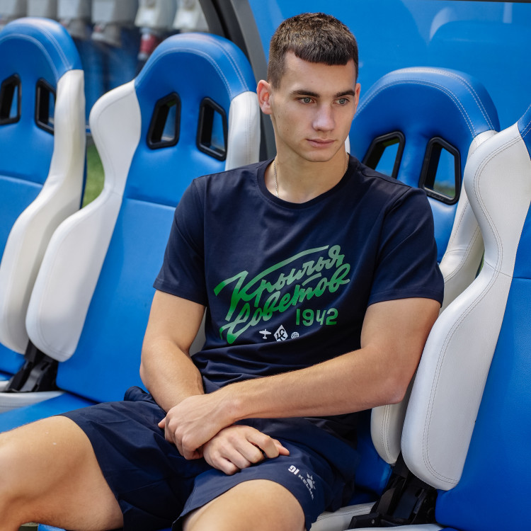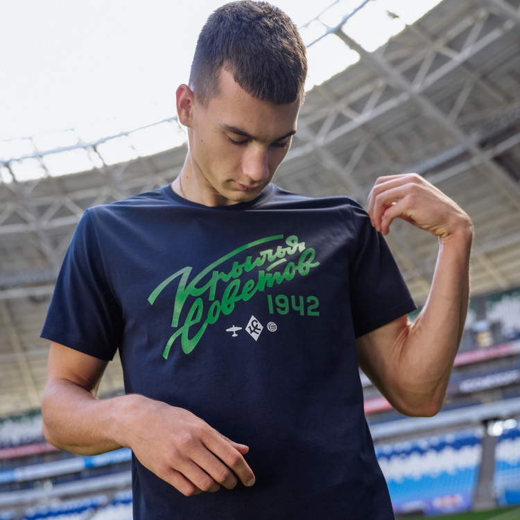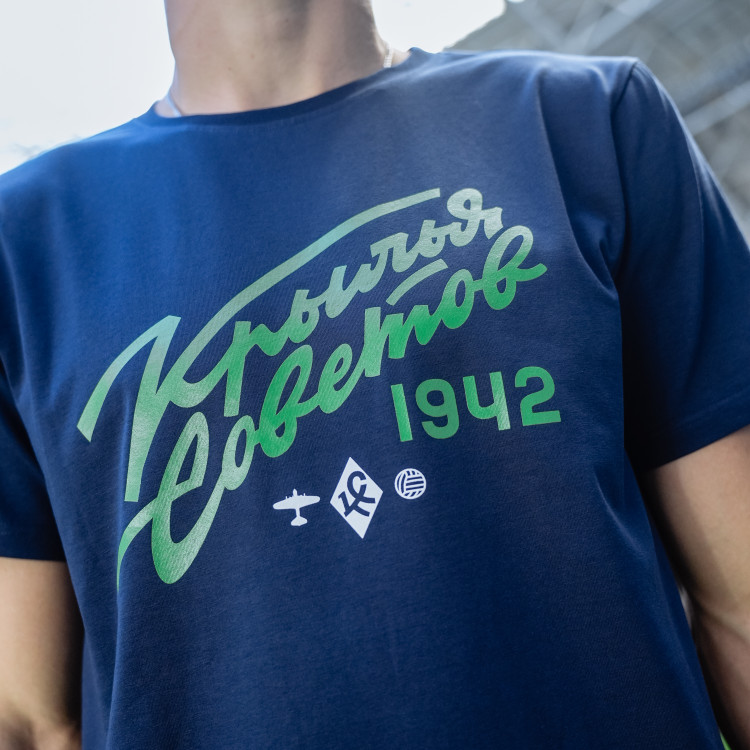 Футболка с надписью "Крылья Советов" (Volga Mama) цвет - нави состав: 90% хлопок, 10% эластан Совместная коллаборация "Крылья Советов" и "Волга Мама"