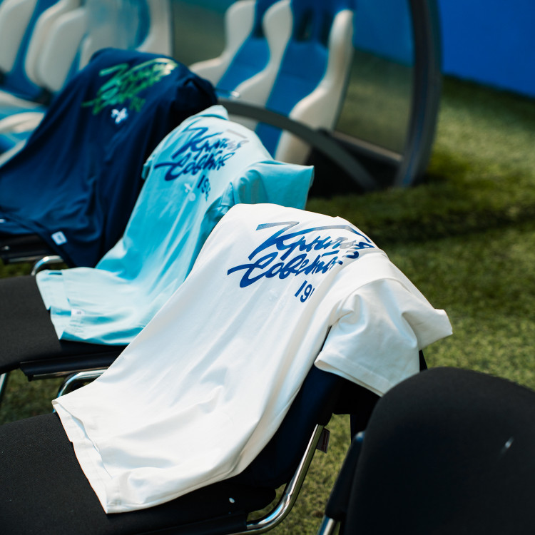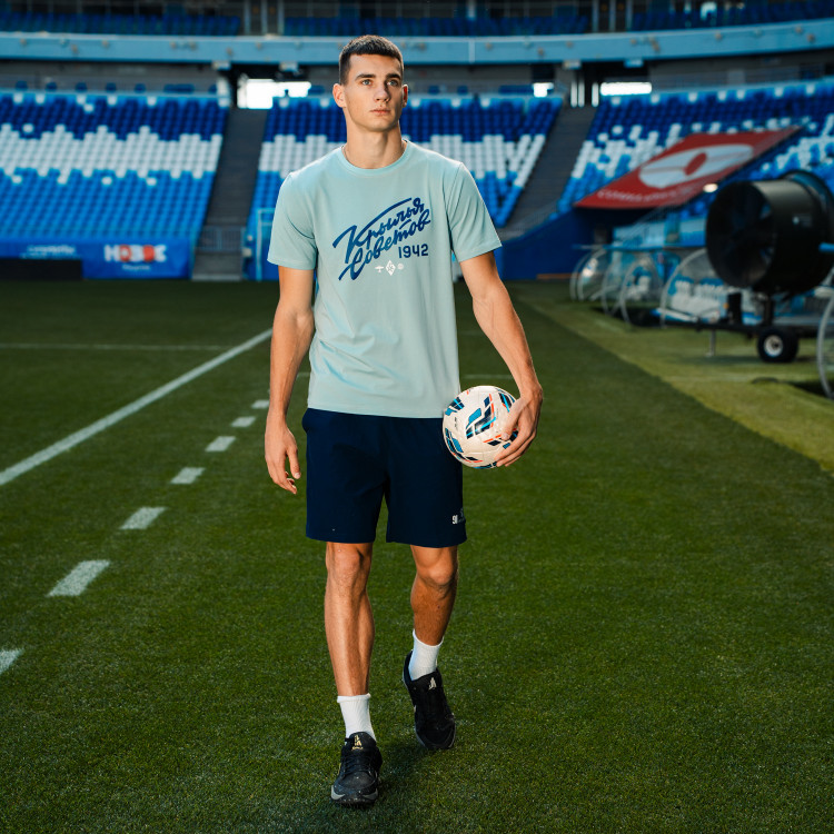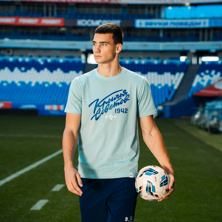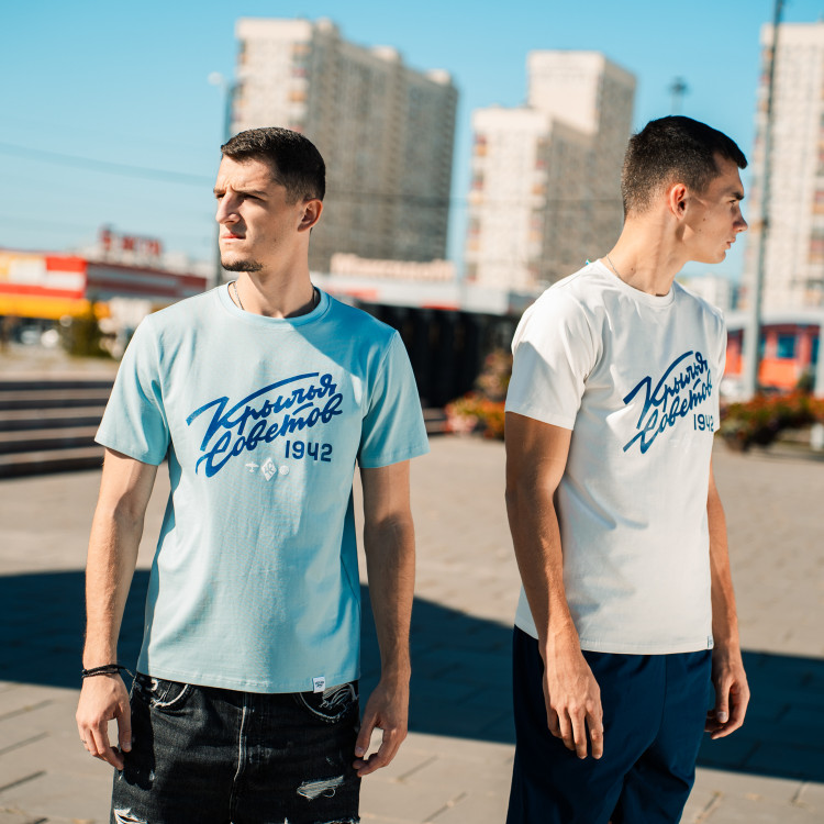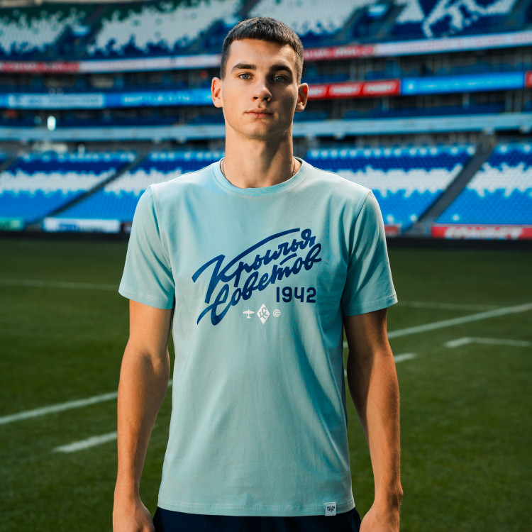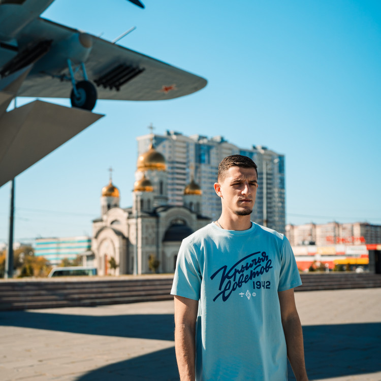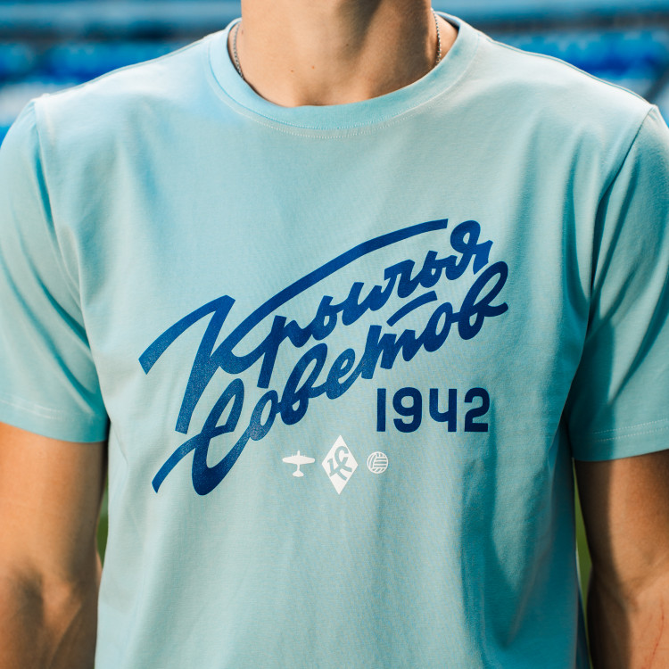 Футболка с надписью "Крылья Советов" (Volga Mama) Цвет - голубой Состав: 90% хлопок, 10% эластан. Совместная коллаборация "Крылья Советов" и "Волга Мама"