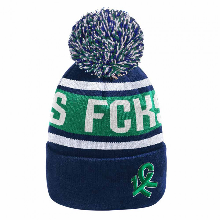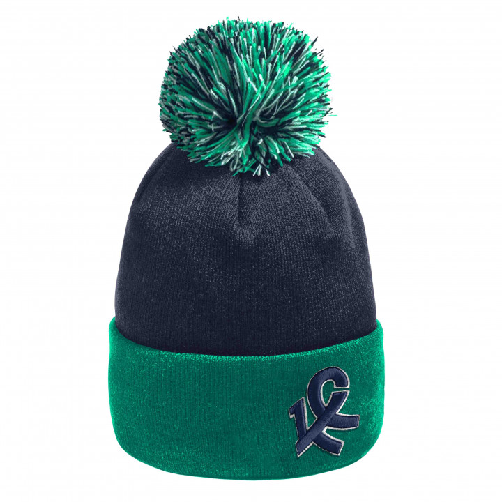 Шапка детская КС синяя с зеленым отворотом и помпоном