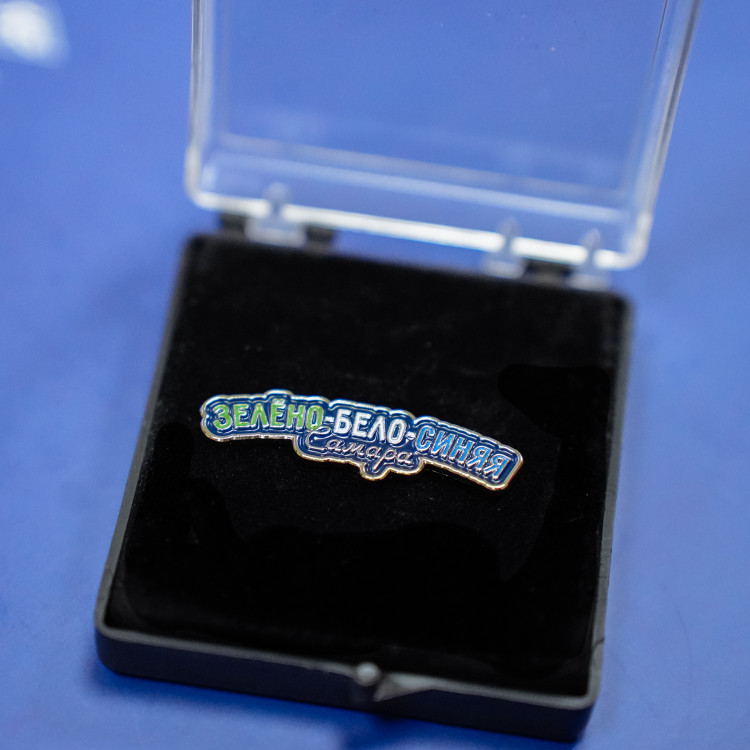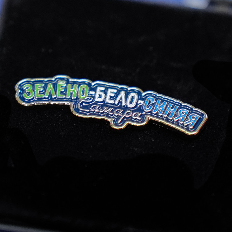 Значок Зелено-Бело-Синяя Самара металлический. Покрытие никель, лицевая сторона 2D рельефный металл + 4 мягкие эмали. Размер 11х40 мм, толщина 1,5 мм. Крепление - 2 цанги бабочки. Упаковка - пластиковый бокс.