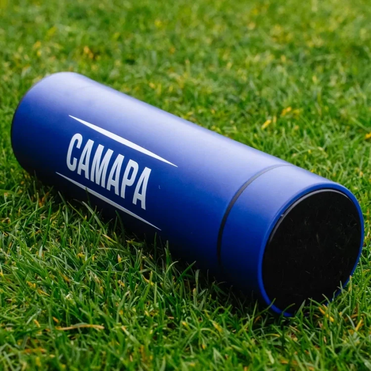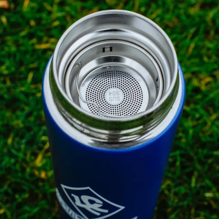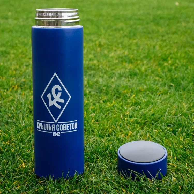 Термос брендированный с датчиком температуры. Объем 0,5 л. Цвет - синий. Надписи: "Самара" и "Крылья Советов" Датчик на крышке отображает температуру внутри термоса.