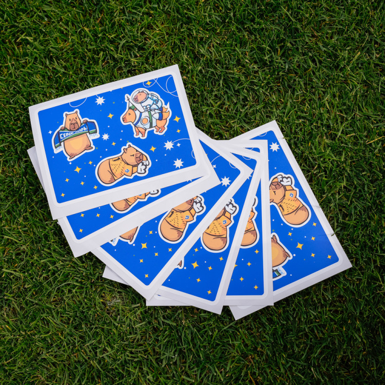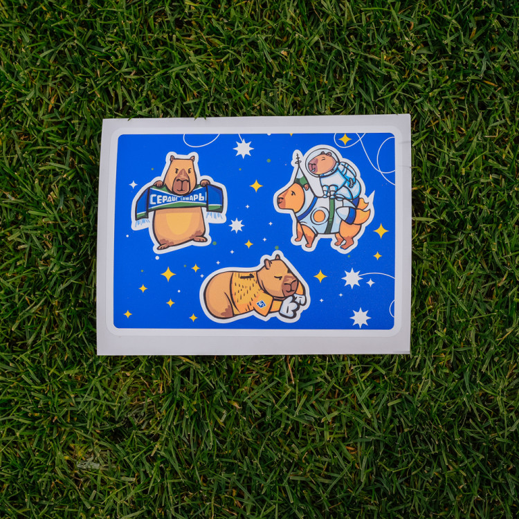 Стикер Капибары КС (вариант с тремя наклейками капибар: в одежде вратаря, космонавтов, с шарфом). Коллекция наклеек состоит из 4-х видов разновидностей наклеек. Если Вы хотите собрать всю коллекцию наклеек, кто необходимо купить 4 разных вида стикеров.