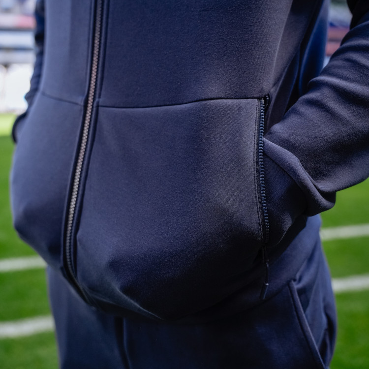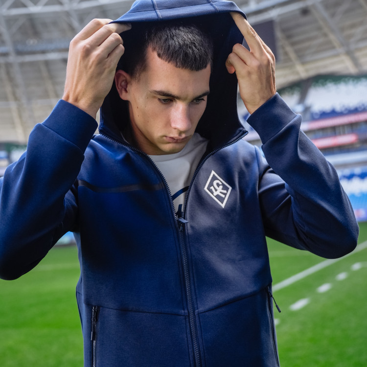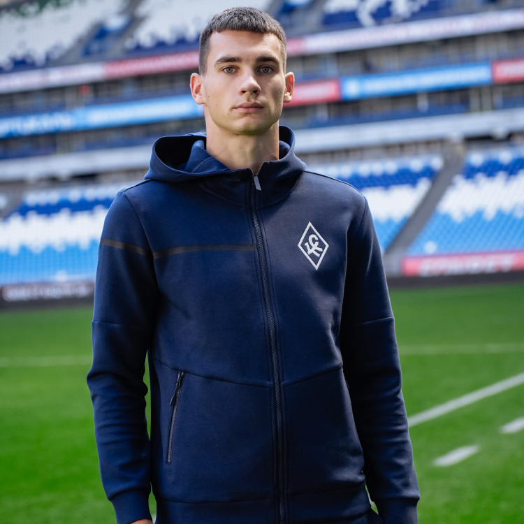 Костюм тренировочный х/б сезон 2025-2026 Kelme. Цвет - темно-синий. Костюм скомплектован из толстовки и брюк. Толстовка на молнии с капюшоном и карманами, логотип Ромб КС на левой груди. Брюки на резинке со шнуровкой, и карманами. Состав - х/б.