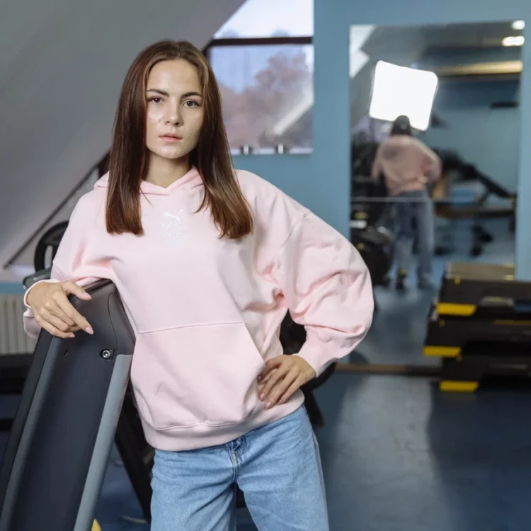 Худи женское розовое Puma. С капюшоном, рукава модельного кроя. Логотип вышивка.
